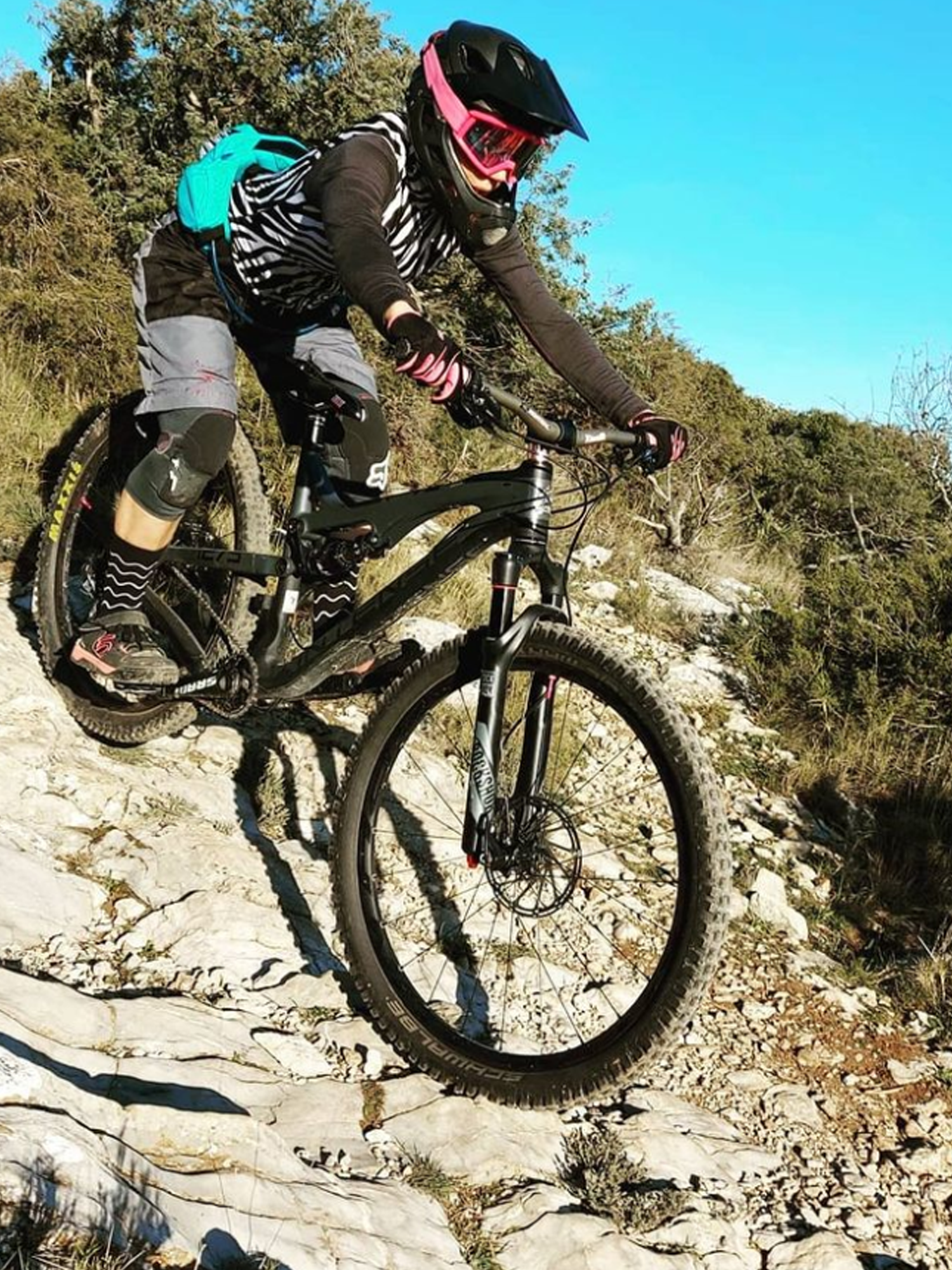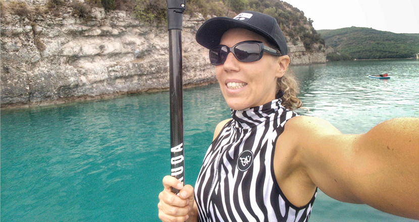 Jeanne, est une athlète VTT amatrice : "Franchement ta marque répond à 200% à ce que je recherchais en protec ( je n' ai jamais trouvé de protec qui me plaisaient) et tu vois j'ai tellement adhéré et adoré que j en avais acheté 3 d’un coup par peur de ne plus en trouver. J aime rider avec classe même si le niveau n’est pas celui d’une championne du monde mais sur le bile park je fais mon effet et on me demande des fois si je vais au resto ou rouler , pourquoi rider voudrait dire sac à patate :) Franchement je suis fan ! " Jeanne porte sa protection dorsale, pour faire du VTT, et aussi du ... Paddle !